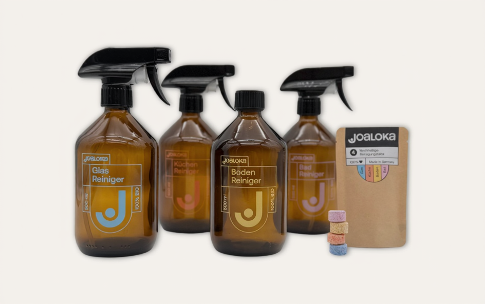 Vorzugsweise Flaschen aus Glas. Diee sind langlebiger und es ist einfach umweltfreundlicher. Bei Plastikflaschen können sich im Laufe der Zeit Mikroplastikpartikel lösen und in die Umwelt gelangen. Du kannst aber auch gern deine alten Reinigungsflaschen ausspülen und wieder verwenden, bevor sie im Müll landen. Unsere Joaloka Glasflaschen bestehen aus braunen Apotheker-Glas. So dringt weniger UV-Strahlung in die Flache ein und die Reinigungsleistung bleibt immer gleich erhalten.
