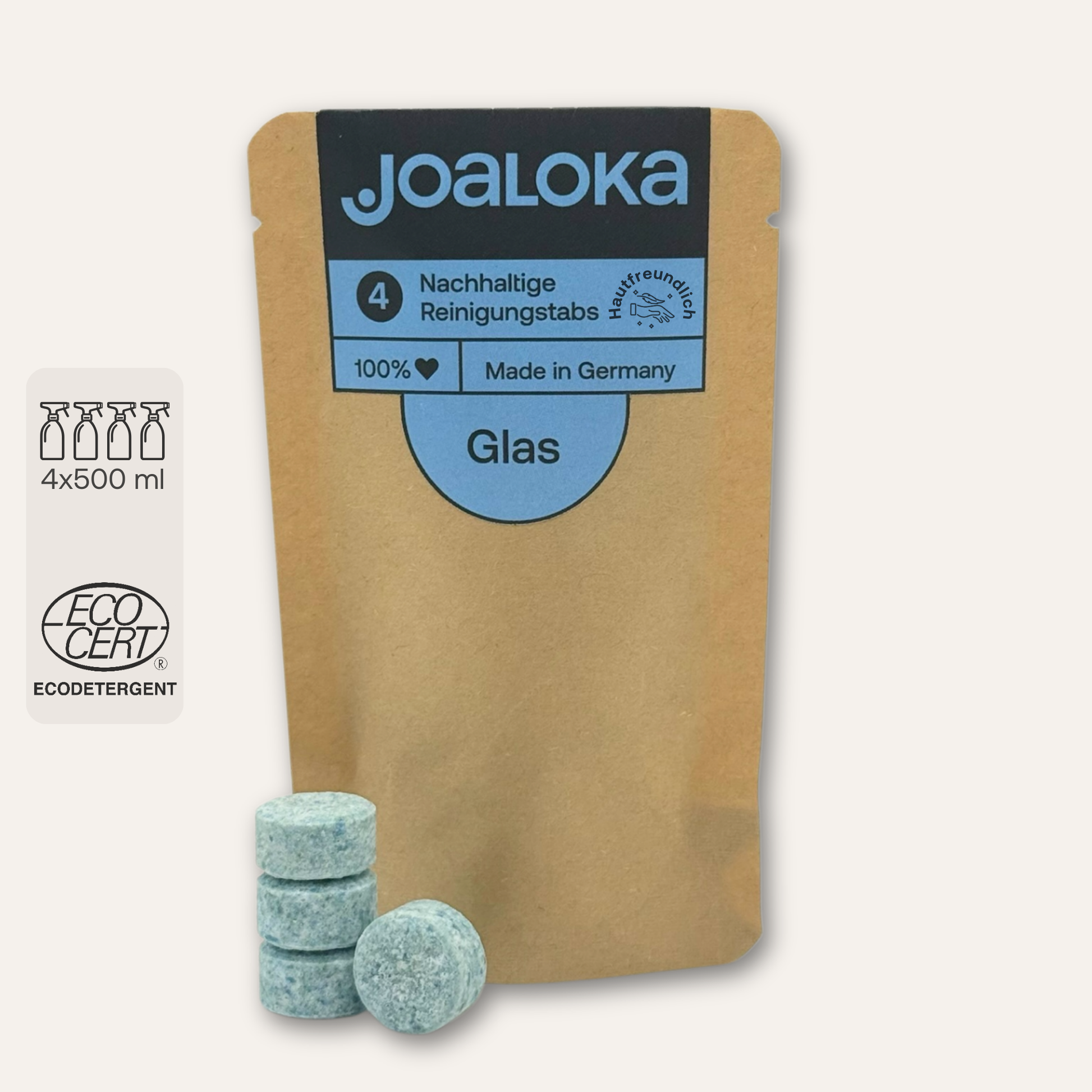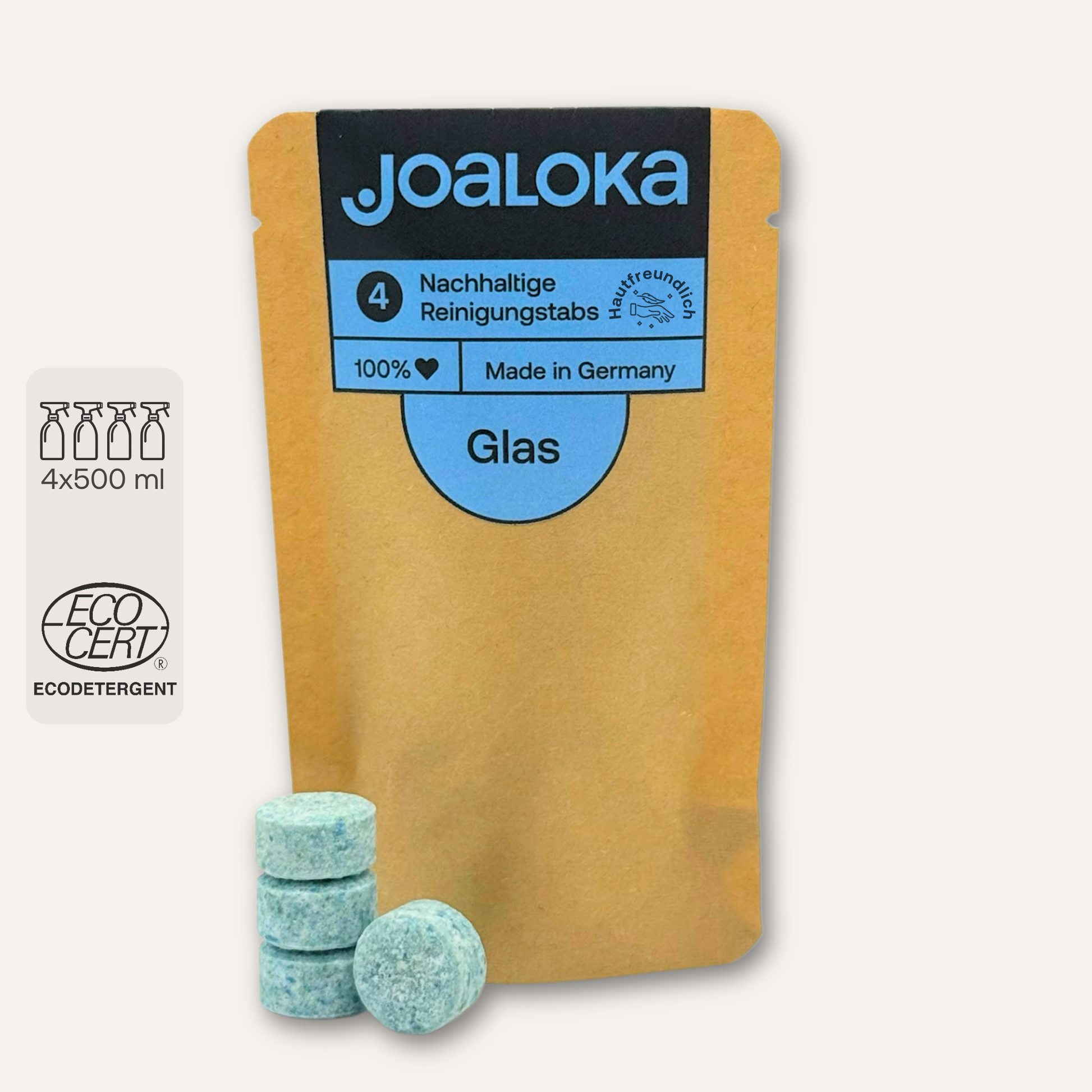 Die Joaloka Glasreiniger Tabs sorgen für streifenfreie Sauberkeit auf all deinen Glasflächen. In der Packung befinden sich vier Tabs, die zusammen mit der Joaloka Glasflasche verwendet werden.