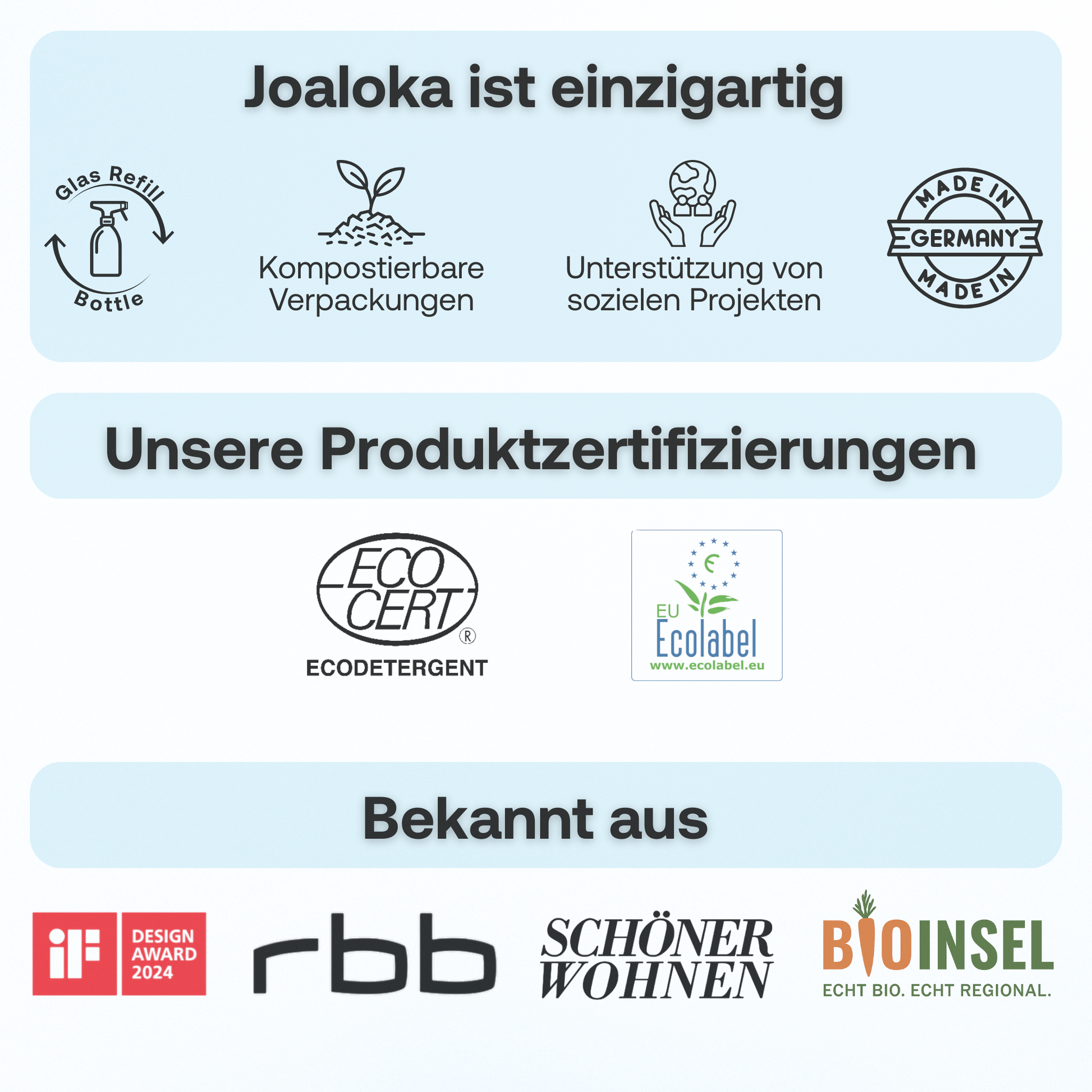 • "Hervorragendes Reinigungsmittel! Wirksam, angenehm duftend und nachhaltig – Joaloka beeindruckt mit hochwertigen Produkten. Vielen Dank! Klare Empfehlung zum Kauf!"