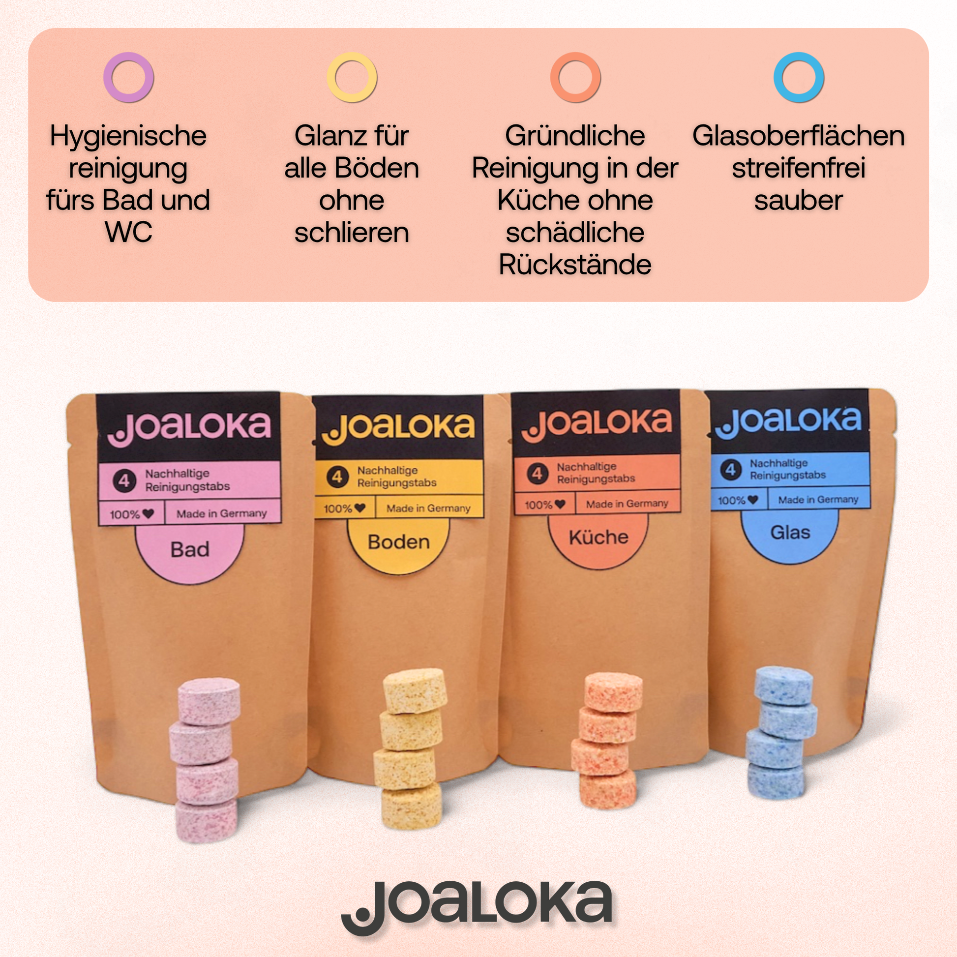 Unsere Küchenreiniger-Tabs bieten eine nachhaltige Lösung für die Reinigung deiner Küche. Jede Packung enthält vier Tabs, die speziell für die Verwendung mit der Joaloka Glasflasche entwickelt wurden.